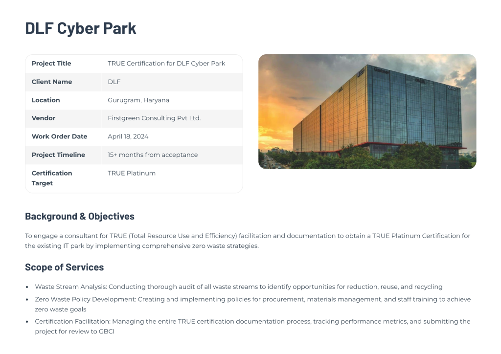 Firstgreen Consulting is managing the complete certification facilitation, which includes overseeing all documentation, tracking performance metrics, and submitting the project for review to the Green Business Certification Inc. (GBCI). This endeavor positions DLF Cyber Park as a benchmark for sustainable operations within the IT sector.