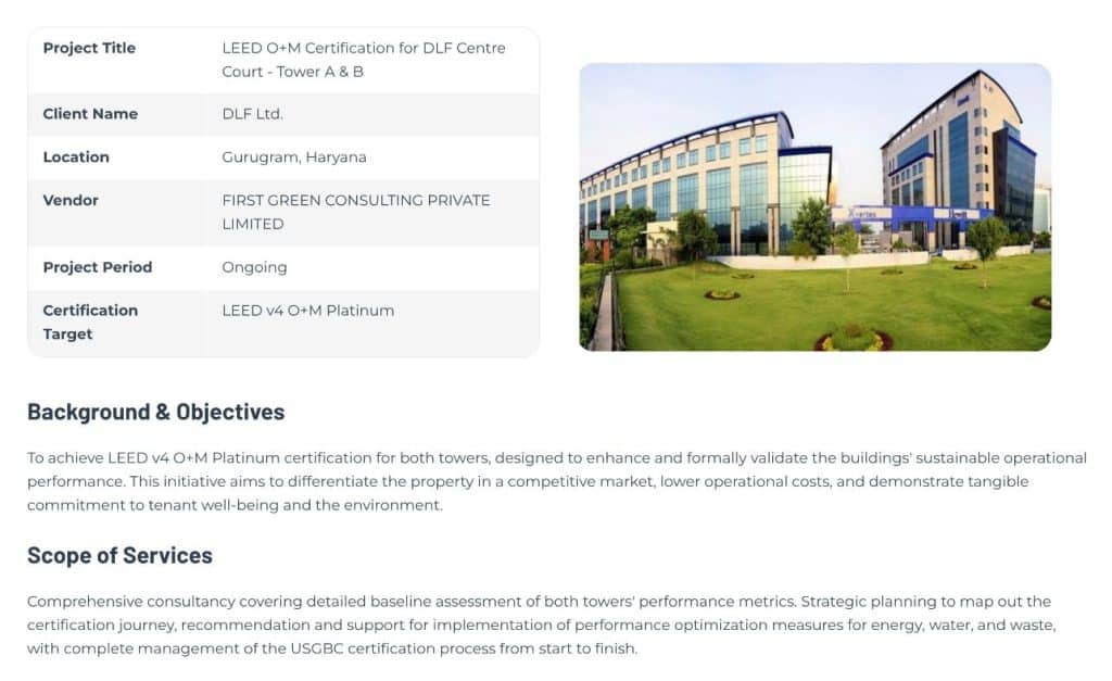 In collaboration with First Green Consulting Pvt. Ltd., our comprehensive consultancy covers the entire certification journey. This includes a detailed baseline assessment of both towers’ performance metrics, strategic planning, and support for implementing performance optimization measures across energy, water, and waste systems. We are managing the entire USGBC certification process from start to finish, ensuring DLF Centre Court secures its status as a high-performance, sustainably-operated asset.