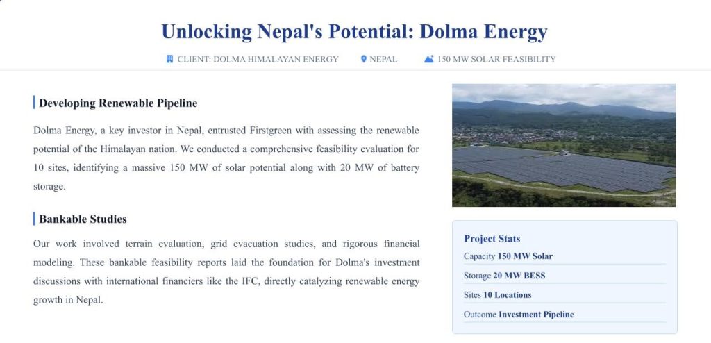Nepal stands at a pivotal moment in its clean energy transition, and Dolma Energy is at the forefront of this national transformation. As a leading investor committed to accelerating sustainable development, Dolma Energy engaged Firstgreen to evaluate Nepal’s renewable energy potential through a series of bankable feasibility studies. This strategic initiative aims to unlock large-scale solar opportunities and strengthen the country’s long-term energy security.