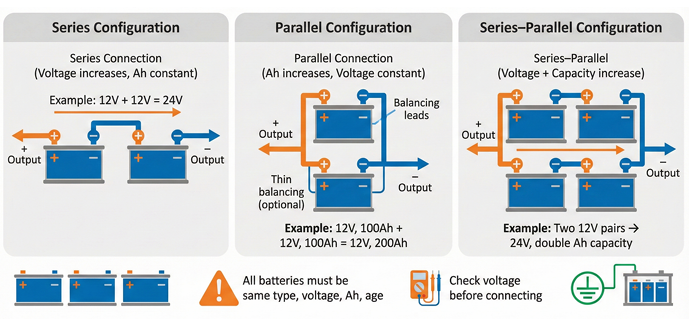 A series–parallel configuration combines both methods to increase voltage and capacity simultaneously. Batteries are first connected in series to reach the required voltage, then multiple strings are connected in parallel to increase Ah capacity.
