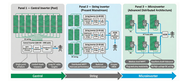 Based on the detailed architectural diagram provided, let’s explore the three major stages of inverter evolution: Central, String, and Microinverters.