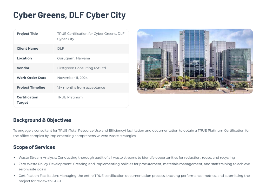 Firstgreen Consulting is managing the entire TRUE certification facilitation process, which includes overseeing all documentation, tracking performance metrics, and submitting the project for a final review to the Green Business Certification Inc. (GBCI). This initiative, with a project timeline of 15+ months starting from the November 11, 2024 work order date, underscores Cyber Greens’ commitment to leading the way in environmental stewardship and operational excellence.