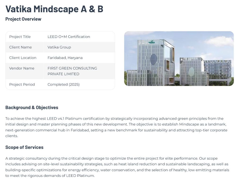 The Vatika Mindscape A & B project in Faridabad, Haryana, owned by the Vatika Group, is a next-generation commercial hub that successfully completed its LEED v4.1 Platinum certification in 2025. Guided by First Green Consulting Private Limited, the core objective was to establish Mindscape as a landmark and set a new benchmark for sustainability to attract top-tier corporate clients. This achievement was secured by strategically incorporating advanced green principles from the initial design and master planning phases. Our scope of services involved a strategic consultancy during the critical design stage to optimize the entire project for elite performance. This included advising on site-level sustainability strategies, such as heat island reduction and sustainable landscaping, as well as building-specific optimizations for energy efficiency, water conservation, and the selection of healthy, low emitting materials. This rigorous, comprehensive approach ensured the project met the demanding requirements for LEED Platinum.