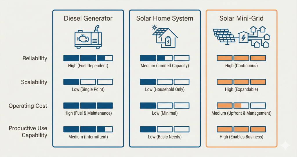 Diesel offers short-term reliability at high recurring cost. Solar Home Systems provide affordable access but limited growth potential. Solar Mini-Grids offer scalable, reliable, and economically transformative power infrastructure.