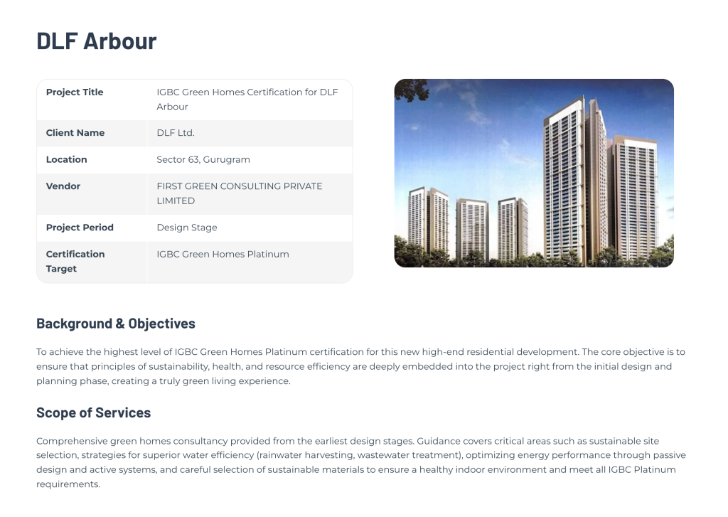 DLF Arbour, a new high-end residential development in Sector 63, Gurugram, is being meticulously designed from its initial stages to achieve the highest level of IGBC Green Homes Platinum certification. In collaboration with sustainability consultants FirstGreen Consulting, the project’s core objective is to deeply embed the principles of sustainability, health, and resource efficiency into the very fabric of its design to create a truly green living experience. This comprehensive approach includes guidance on critical areas such as sustainable site selection, strategies for superior water efficiency like rainwater harvesting and wastewater treatment, optimizing energy performance through a combination of passive and active systems, and the careful selection of sustainable materials. By integrating these elements from the ground up, DLF Arbour is set to meet all IGBC Platinum requirements and establish a new benchmark for luxury residential properties that prioritize both occupant well-being and environmental responsibility.