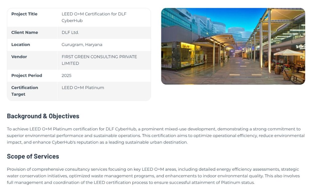 DLF CyberHub in Gurugram, Haryana, operates to the rigorous standard of LEED O+M Platinum Certification, a testament to its superior environmental performance and commitment to sustainability. As a flagship mixed-use development managed for DLF Ltd., CyberHub is recognized as a leading sustainable urban destination.