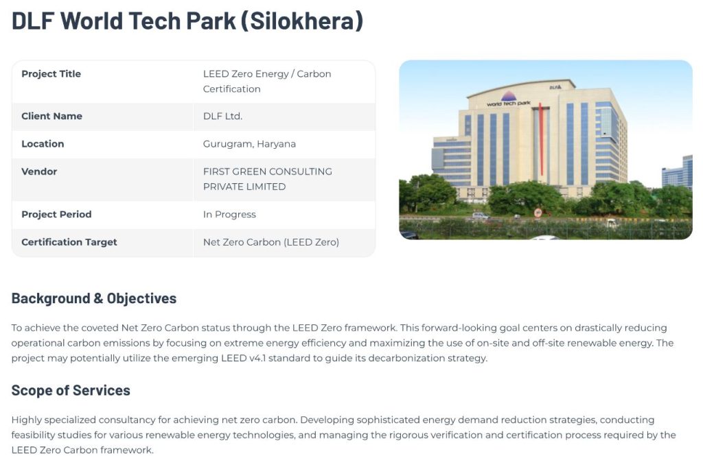 FirstGreen is providing highly specialized services, including the development of sophisticated energy demand reduction plans, conducting comprehensive feasibility studies for various renewable technologies, and meticulously managing the rigorous verification and certification process required by the LEED Zero Carbon framework. Achieving this certification will establish DLF World Tech Park as a benchmark for decarbonized, high-performance commercial real estate.