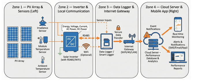 A well-designed solar PV monitoring architecture integrates sensors, inverters, communication networks, and cloud analytics into a unified system. By structuring monitoring into clear zones, stakeholders gain accurate performance insight, faster fault response, and long-term operational confidence. In modern solar PV plants, monitoring is not just about data—it is about control, optimization, and value protection