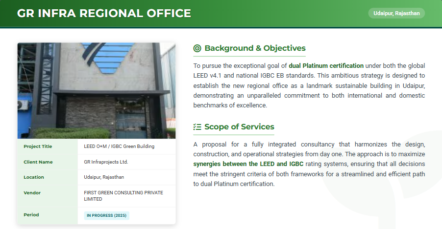 GR Infra’s upcoming Regional Office in Udaipur is pursuing a unique and ambitious objective—dual Platinum certification under both LEED v4.1 and IGBC Green Building frameworks. This approach harmonizes international and national benchmarks for sustainability, positioning the building among India’s most advanced green commercial facilities.