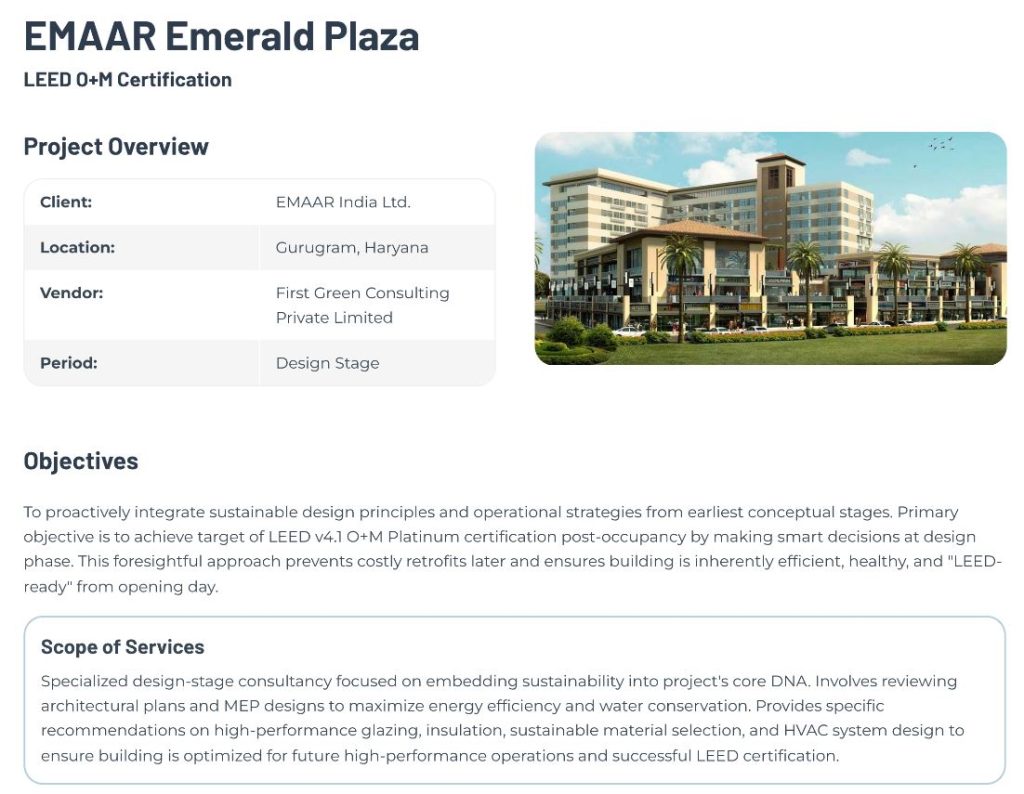 EMAAR Emerald Plaza in Gurugram, Haryana, is taking a proactive approach to sustainability by integrating design principles and operational strategies from the earliest conceptual stages to achieve LEED v4.1 O+M Platinum certification post-occupancy. This forward-thinking strategy, led by EMAAR India Ltd. and managed by First Green Consulting Private Limited during the Design Stage, aims to make smart decisions now to prevent costly retrofits later, ensuring the building is inherently efficient, healthy, and “LEED-ready” from opening day.