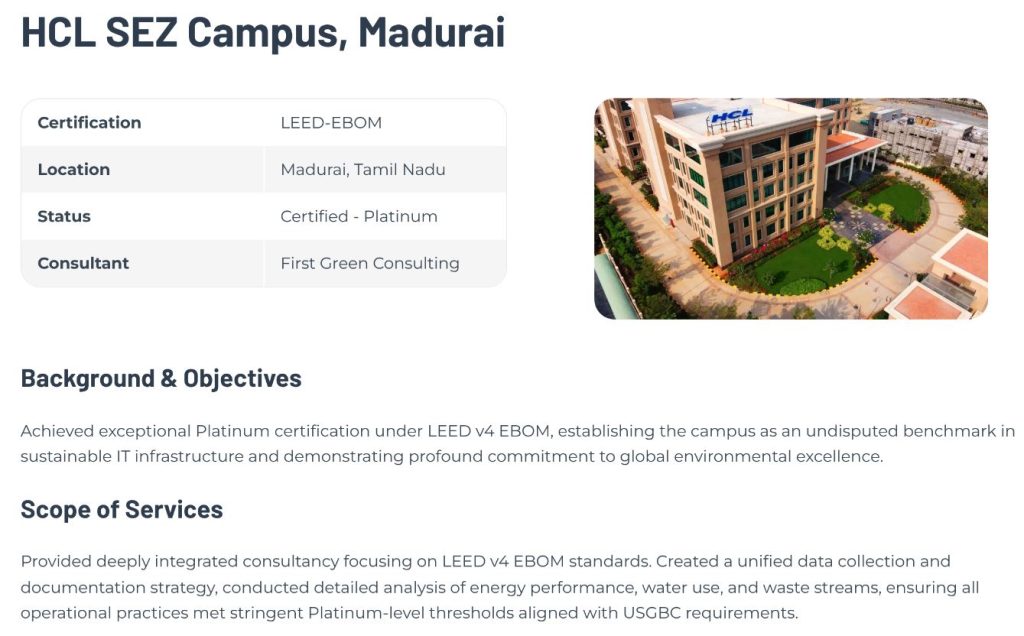 The HCL SEZ Campus in Madurai, Tamil Nadu, has achieved the exceptional LEED v4 EBOM (Existing Buildings Operations and Maintenance) Platinum certification. This milestone establishes the campus as an undisputed benchmark in sustainable IT infrastructure and demonstrates HCL’s profound commitment to global environmental excellence. The certification was secured with consultancy from First Green Consulting. We provided a deeply integrated consultancy focusing on rigorous LEED v4 EBOM standards. Our services included creating a unified data collection and documentation strategy, conducting detailed analysis of energy performance, water use, and waste streams. This comprehensive approach ensured all operational practices at the campus met the stringent Platinum-level thresholds, aligning the facility with the highest requirements set by the USGBC.