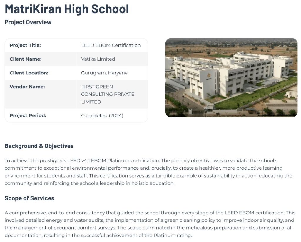 MatriKiran High School, a client of Vatika Limited in Gurugram, Haryana, has successfully achieved the prestigious LEED v4.1 EBOM (Existing Buildings Operations and Maintenance) Platinum certification. This significant achievement, completed in 2024 with guidance from First Green Consulting Private Limited, serves as a powerful validation of the school’s deep commitment to exceptional environmental performance and holistic education. The primary objective of the project was to create a healthier, more productive learning environment for its students and staff, setting a tangible example of sustainability for the community. Our end-to-end consultancy services guided the school through every stage of the rigorous certification process. This included detailed energy and water audits, the implementation of a new green cleaning policy to significantly improve indoor air quality, and comprehensive management of occupant comfort surveys. The scope culminated in the meticulous preparation and submission of all required documentation, ultimately resulting in the highest possible Platinum rating. This certification reinforces MatriKiran High School’s leadership in providing a world-class, environmentally responsible educational setting.