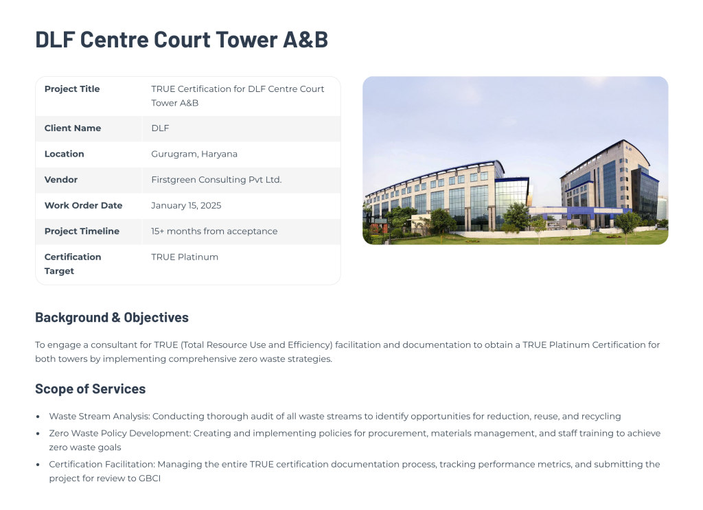 Firstgreen Consulting is managing the entire TRUE certification facilitation process, which includes overseeing all documentation, tracking performance metrics, and submitting the project for a final review to the Green Business Certification Inc. (GBCI). This initiative, with a project timeline of 15+ months starting from the January 15, 2025 work order date, underscores DLF Centre Court Tower A&B’s commitment to leading the way in environmental stewardship and operational excellence.