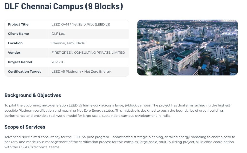 Setting a new benchmark for sustainable development in India, the entire DLF Chennai Campus is pioneering the next-generation LEED v5 framework. This ambitious project, scheduled for 2025-26, is a collaboration between DLF Ltd. and sustainability consultants FirstGreen Consulting, with groundbreaking dual objectives: to achieve the highest possible LEED v5 Platinum certification while simultaneously reaching Net Zero Energy status.