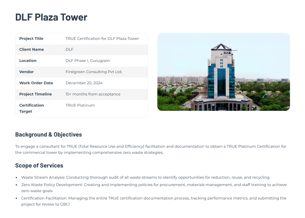 Firstgreen Consulting is managing the entire TRUE certification facilitation process, which includes overseeing all documentation, tracking performance metrics, and submitting the project for a final review to the Green Business Certification Inc. (GBCI). This initiative, with a project timeline of 15+ months starting from the December 20, 2024 work order date, underscores DLF Plaza Tower’s commitment to leading the way in environmental stewardship and operational excellence.