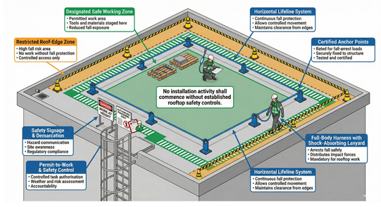 A critical message in the image states that no installation activity should commence without established rooftop safety controls. This reflects best practice in occupational health and safety management.