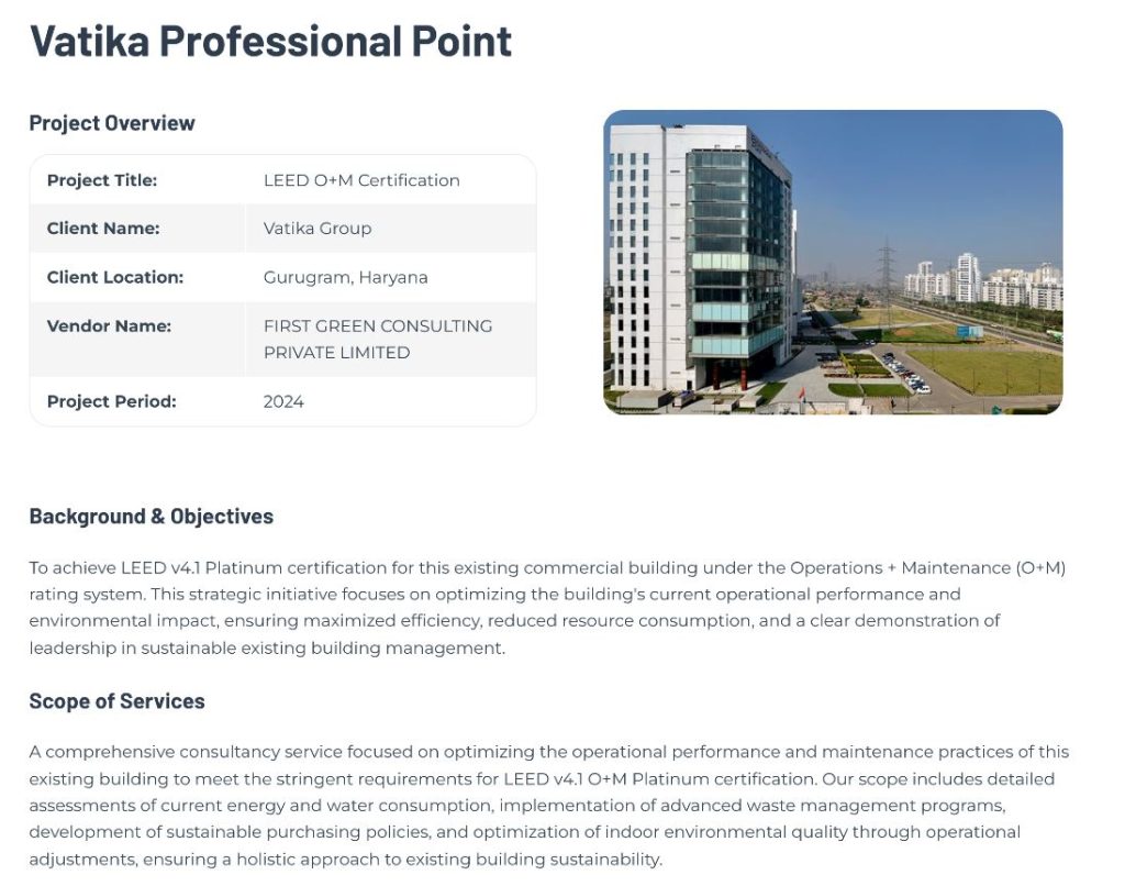 Vatika Professional Point, a prominent commercial building owned by the Vatika Group in Gurugram, Haryana, has successfully completed its LEED v4.1 O+M (Operations + Maintenance) Certification in 2024. This strategic initiative, guided by First Green Consulting Private Limited, was driven by the ambitious goal of achieving the Platinum certification. The project focuses on optimizing the building’s current operational performance and environmental impact, ensuring maximized efficiency, reduced resource consumption, and a clear demonstration of leadership in sustainable existing building management. Our comprehensive consultancy service focused entirely on optimizing the operational performance and maintenance practices of this existing building to meet the stringent requirements for LEED v4.1 O+M Platinum. Our scope included detailed assessments of current energy and water consumption, implementation of advanced waste management programs, development of sustainable purchasing policies, and optimization of indoor environmental quality through operational adjustments, ensuring a holistic approach to existing building sustainability.