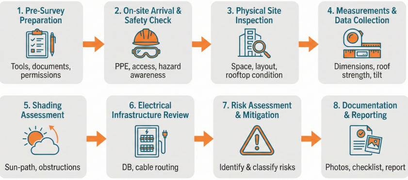 A successful solar photovoltaic (PV) installation begins long before panels are mounted or inverters are commissioned. The foundation of an efficient, safe, and compliant solar project lies in a comprehensive site survey. The illustrated workflow highlights the eight critical stages of a professional solar PV site assessment, ensuring that technical feasibility, safety, and performance risks are addressed early. This blog explains each step in detail and demonstrates why a structured site survey is essential for both residential and commercial solar projects.