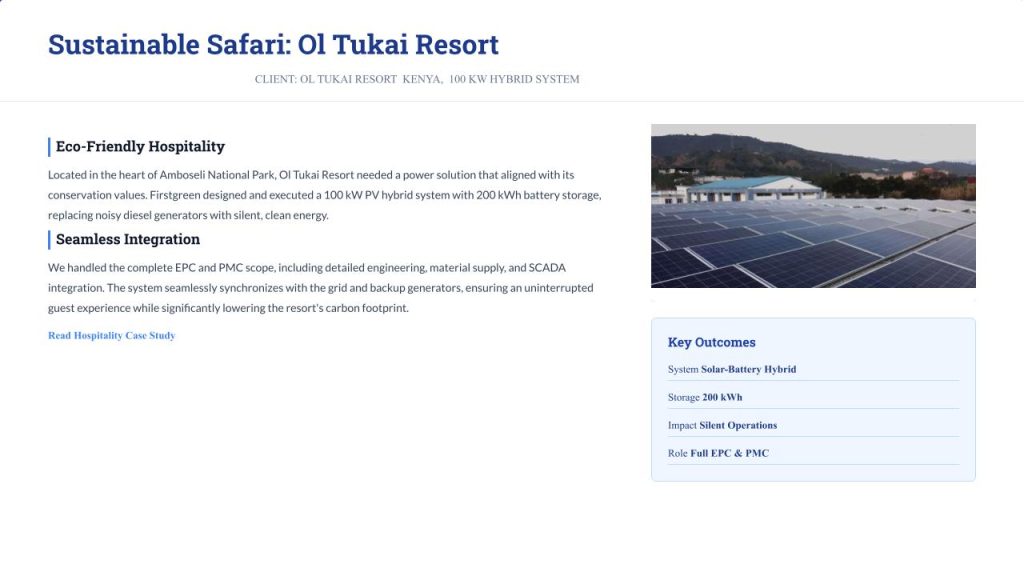 Kenya’s world-renowned Amboseli National Park, Ol Tukai Resort is known for its breathtaking landscapes, wildlife-rich surroundings, and strong commitment to ecological stewardship. To align its operations with its conservation-led philosophy, the resort sought a clean and reliable energy solution. Ol Tukai Resort partnered with Firstgreen Consulting Pvt. Ltd to design and deploy a robust 100 kW solar PV hybrid system integrated with a 200 kWh battery energy storage solution. This renewable energy transformation enables the resort to operate silently and sustainably, enriching the guest experience while minimizing environmental impact.