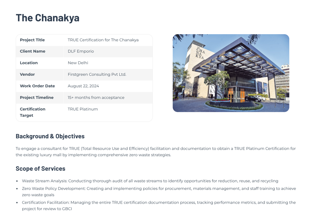 The Chanakya, a luxury mall in New Delhi, is taking a definitive step in sustainable operations by pursuing the highest possible certification for zero waste, TRUE Platinum. This major initiative by DLF Emporio aims to achieve Total Resource Use and Efficiency (TRUE) by implementing comprehensive zero waste strategies across the existing mall. In partnership with sustainability consultants Firstgreen Consulting Pvt. Ltd., the project will follow a rigorous methodology, commencing with an in-depth waste stream analysis to identify all opportunities for reduction, reuse, and recycling. Based on these findings, robust zero waste policies will be developed and implemented, covering procurement, materials management, and staff training to ensure the achievement of zero waste goals. Firstgreen Consulting is managing the entire TRUE certification facilitation process, which includes overseeing all documentation, tracking performance metrics, and submitting the project for a final review to the Green Business Certification Inc. (GBCI). This initiative, with a project timeline of 15+ months starting from the August 22, 2024 work order date, underscores The Chanakya’s commitment to leading the way in environmental stewardship and operational excellence.