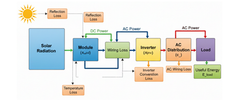 The diagram makes an important point: solar PV system performance is not defined by module efficiency alone. Total system performance is determined by the cumulative effect of all losses across the energy chain.