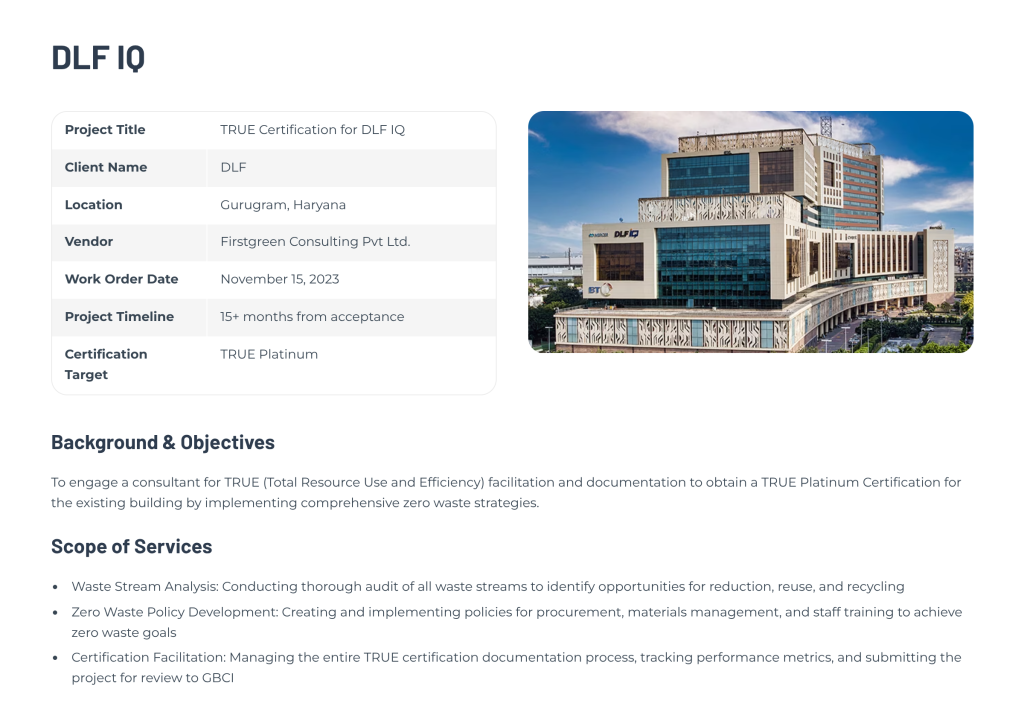 Firstgreen Consulting is tasked with facilitating the entire certification process, which includes managing documentation, tracking key performance metrics, and submitting the project for final review to the Green Business Certification Inc. (GBCI). This endeavor positions DLF IQ as a leader in sustainable building management and responsible resource consumption.