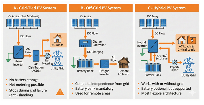 All solar PV systems begin with a PV array, which converts sunlight into DC electricity. The key differences between system types lie in how this DC power is converted, stored, and managed in relation to the utility grid and on-site loads.