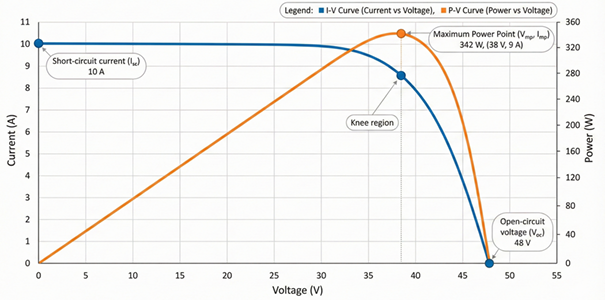 The knee of the I-V curve is the most important operating region of the module. This is where the module produces maximum usable power. The exact point at which voltage multiplied by current reaches its highest value is called the Maximum Power Point (MPP). The corresponding voltage and current are labeled Vmp and Imp. Modern inverters continuously track this point using Maximum Power Point Tracking (MPPT) algorithms to ensure the module delivers the highest possible energy throughout the day.